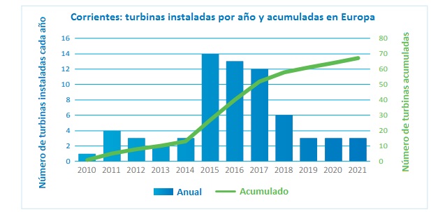 Hasta 2,2 megavatios de nueva potencia (en dispositivos de aprovechamiento de las corrientes) han sido instalados en 2021 en Europa, casi diez veces más que en 2020. El crecimiento estaba previsto, en todo caso, pues muchos proyectos en marcha habían sido suspendidos el año anterior como consecuencia del Covid. OEE estima que se producirá otro acelerón en torno al año 2025, cuando prevé que entre a operar una nueva generación de dispositivos.