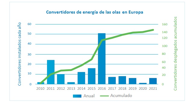 Cinco ingenios undimotrices han sido desplegados en Europa en 2021, de cuatro tecnologías diferentes, lo que denota -apuntan desde la OEE- un saludable estado de la I+D en el sector. Según la Asociación, la diversidad es en todo caso fruto de los muy distintos recursos que persiguen las diferentes empresas que están desarrollando estas soluciones: olas en la costa o en altamar, climas suaves o extremos, etcétera, etc.