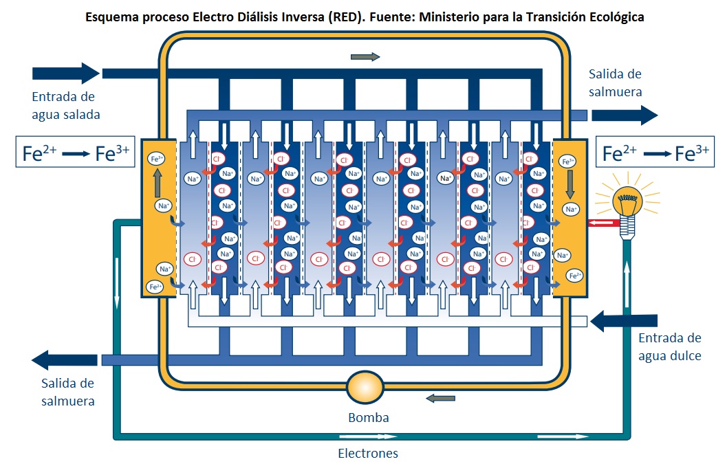 La integración del proceso RED con el proceso de ósmosis inversa convencional -informa Sacyr- permitirá recuperar hasta un 20% de la energía utilizada en el proceso de ósmosis inversa generando energía limpia y renovable a partir de la salmuera de agua de mar, y reduciendo las emisiones de CO2 del proceso de desalación. Además, reduce la salinidad de la salmuera antes de su vertido al mar. La electrodiálisis inversa es un proceso de generación de energía eléctrica a partir del gradiente salino entre dos disoluciones de diferente salinidad. En el proyecto LIFE Hyreward -explican desde Sacyr- se utilizará la "salmuera procedente del proceso de ósmosis inversa de agua de mar" como corriente de alimentación de alta salinidad y "agua residual tratada" como corriente de baja salinidad, aprovechando el gradiente osmótico entre ellas para la generación de energía eléctrica.