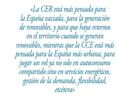 Para empezar, lo obvio: la CER tiene que ser solo... de energía renovable. Mientras que la CCE no tiene por qué. Segunda diferencia: la CER está muy orientada a la generación; mientras que la CCE está más orientada a todos los papeles del sector eléctrico. La Directiva [2019/944], cuando hace la definición de CCE, habla de que podrán suministrar, ofrecer servicios energéticos, agregación, flexibilidad, e incluso dice que podrán operar en distribución. Más cosas: la CCE debe estar formada como decía por personas físicas, pymes y entes locales, mientras que en la CER no hay una especificación tan clara. En el caso de las Comunidades de Energías Renovables casi diría que nos encontramos simplemente con una... “idea”, una idea que aparece de forma incipiente en la Directiva de renovables [2018/2001], que es una directiva que es previa a la del Mercado Interior de Electricidad... Mientras que en el caso de las Comunidades Ciudadanas de Energía lo que encontramos (en la Directiva del Mercado Interior de Electricidad) es un desarrollo mucho más detallado, un desarrollo que hace ya una definición muy exacta, y dándoles muchas prerrogativas, a las CCE. En ambos casos, pero particularmente en la Directiva del Mercado Interior de Electricidad, lo que se dice es que los estados deberán dar prerrogativas a dichas comunidades. Entonces, yo te diría que la CER está más pensada para la España vaciada, para la generación de renovables, y para que haya retornos en el territorio cuando se generan renovables, mientras que la CCE está más pensada para la España más urbana, para jugar un rol ya no solo en autoconsumo compartido sino en servicios energéticos, gestión de la demanda, flexibilidad, etcétera.