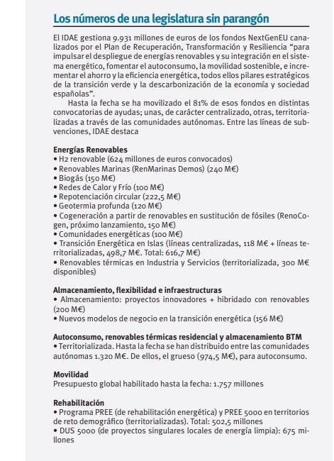 Bueno, vamos a ver: para empezar elaboramos desde cero todo un Plan Nacional Integrado de Energía y Clima [Pniec], y, gracias a eso, pudimos arrancar bien el Plan de Recuperación. La propia Comisión Europea [CE] nos decía “ojo, que tenéis un Pniec, un marco, muy potente; usadlo como base para el Plan de Recuperación en 2020”. Y así lo hicimos. ¿Qué ha dado tiempo a hacer en estos tres años y medio? Pues, aparte del Pniec propiamente dicho (porque ese documento ni siquiera estaba empezado cuando llegamos), hemos trabajado mucho en el diseño, y sobre todo en negociar con la CE ese Plan de Recuperación. Han sido muchas horas, muchos días y muchas noches de documentos, trabajo y negociaciones que se han concretado en 9.800 millones de euros [M€] que nos toca gestionar a IDAE, de los cuales ya hemos lanzado el 81%. Es más: vamos a intentar llegar al 100% de aquí a finales de año. Para hacernos una idea clara de qué estoy hablando: en toda la época anterior (2014-2020, el período Feder), teníamos unos 1.400 M€ de fondos que gestionar. Bueno, pues en tres años y medio hemos tenido que gestionar casi 10.000 M€. Y todo ello, sin sacarnos nada de la chistera. Porque publicamos unas manifestaciones de interés, analizamos las 3.600 aportaciones que llegaron (y que nos ayudaron a concretar las líneas de ayuda), y, con todo eso... han salido más de 30 convocatorias, algunas de las cuales están resueltas, y otras, muy avanzadas. ¿Resumen? Casi 10.000 M€, más del 80% lanzado, con una atención tanto para acertar en lo estratégico como en lo concreto, con ese diálogo con las empresas, y luego, con supervisión. Porque además hemos armado toda una serie de sistemas de seguimiento y control.