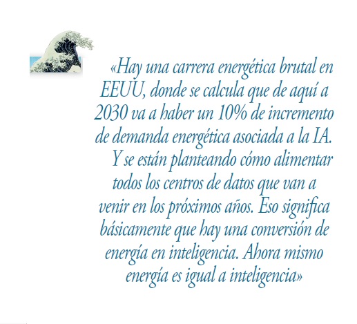 Pero eso hay que pagarlo, y lo tenemos que pagar no comprando tecnología extranjera que en un momento dado pueden dejar de suministrarnos. La gente no se da cuenta de que, si tú no desarrollas tecnología dentro de tu territorio, y si tú no creas las cadenas industriales dentro de tu propio territorio… estás vendido. ¿No hemos aprendido la lección del Covid? Es que no teníamos siquiera capacidad industrial para fabricar mascarillas. Ahora mismo hay una carrera energética brutal, pero brutal, en Estados Unidos, donde se calcula que de aquí a 2030 va a haber un 10% de incremento de demanda energética solo asociada al tema de la inteligencia artificial. Y se están planteando cómo alimentar todos los centros de datos que van a venir en los próximos 3, 4, 5 años. Eso significa básicamente que hay una conversión de energía en inteligencia. Ahora mismo energía es igual a inteligencia, y cuanta más inteligencia seas capaz de colocar en tu proceso, pues más y mejor se desarrollará tu sociedad y más altas serán tus capacidades y mejores tus estándares de vida. Y si tú no tienes esa energía, no tendrás esa capacidad de inteligencia. Europa tiene que aprender de lo que le pasó con Rusia. No podemos depender de la energía de otros.