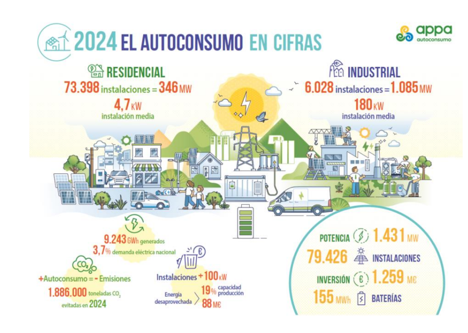 El Informe Anual del Autoconsumo Fotovoltaico de APPA, revela que el sector instaló 1.431 MW de autoconsumo fotovoltaico en España en 2024, lo que supone un recorte de más de veinticinco puntos (-26,3%) con respecto a los 1.943 MW desplegados en 2023. Esta contracción de la potencia instalada fue menor en el sector industrial (-23,4%) que la registrada en el residencial (-34,3%). En total, España cuenta a día de hoy con 8.585 MW (6.304 industriales y 2.281 residenciales).
