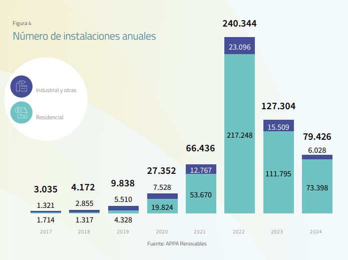 El sector, no obstante, no vive su mejor momento. Según la radiografía APPA del autoconsumo, el sector instaló 240.000 autoconsumos en 2022; se quedó en los 127.000 en 2023; y ha firmado menos de 80.000 en 2024. Son dos años de caída.