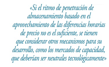 El almacenamiento es indispensable para poder aprovechar todo el potencial de las renovables. Si el ritmo de penetración de almacenamiento basado en el aprovechamiento de las oportunidades que ofrecen las diferencias horarias de precio no es el suficiente, se tienen que considerar otros mecanismos para su desarrollo.
