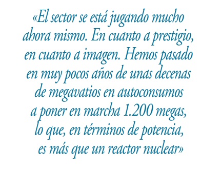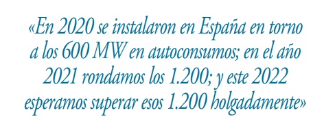 Este es el momento de la consolidación del sector. El sector se está jugando mucho ahora mismo. En cuanto a prestigio, en cuanto a imagen. Hemos pasado en muy pocos años de unas decenas de megavatios en autoconsumos a poner en marcha 1.200 megas. En 2020 nos movimos en torno a los 600 MW; en 2021 rondamos los 1.200; y este 2022 esperamos superar esos 1.200 holgadamente. Ahora, lo que tiene que hacer el sector es, como digo, consolidarse, mantener ese crecimiento, ser capaz de abastecer la demanda y tratar de hacer las cosas con calidad, dando una buena imagen, yendo de la mano de los consumidores, eso es fundamental. El sector tiene que ofrecer opciones óptimas a los consumidores.