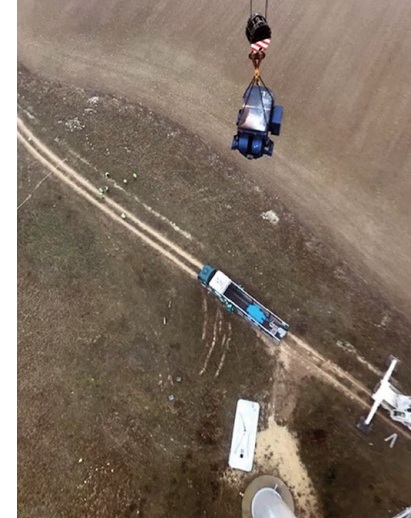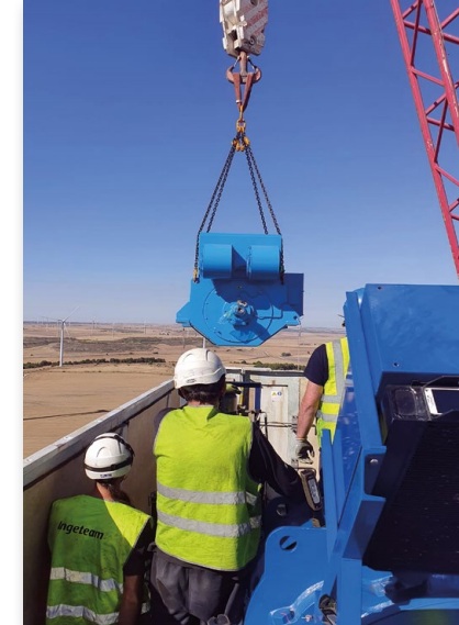 Luego –continúa–,”hacemos unos estiramientos previos: cuello, brazos, piernas. Para entrar un poco en calor y evitar posibles lesiones. Y una vez hemos hecho todo eso, pues vamos a la máquina, para la que el día anterior ya hemos preparado el material necesario: filtros, aceites, grasas y las herramientas que vayamos a necesitar. Lo subimos todo en furgonetas, vamos a nuestra máquina, y llamamos al centro de control para que nos pare la turbina. Una vez está parada y tenemos autorización para entrar, un compañero sube a la nacelle y otro se queda preparando la carga, que iremos subiendo con un polipasto” (que es un aparejo de dos grupos de poleas).