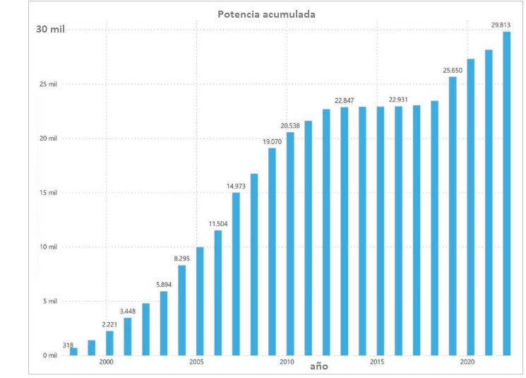 [Bajo estas líneas, evolución de la potencia eólica instalada en España. Fuente: Asociación Empresarial Eólica]