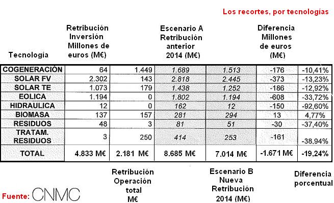 El informe de la CNMC dice literalmente que "la aplicación de los parámetros introducidos por la Propuesta [la "rentabilidad razonable" que sustituye a la prima] supondría un descenso de aproximadamente 1.700 millones de euros (M€) de la retribución específica percibida por el conjunto de las instalaciones a las que es de aplicación". De esos 1.700 M€ de recorte para "el conjunto de las instalaciones" (termosolar, fotovoltaica, minihidráulica, biomasa, gas natural), un tercio los pone (los deja de ingresar) la eólica, que es la tecnología más afectada por el cambio de la prima a la "rentabilidad razonable" (7,5%) que ha fijado por decreto el gobierno.