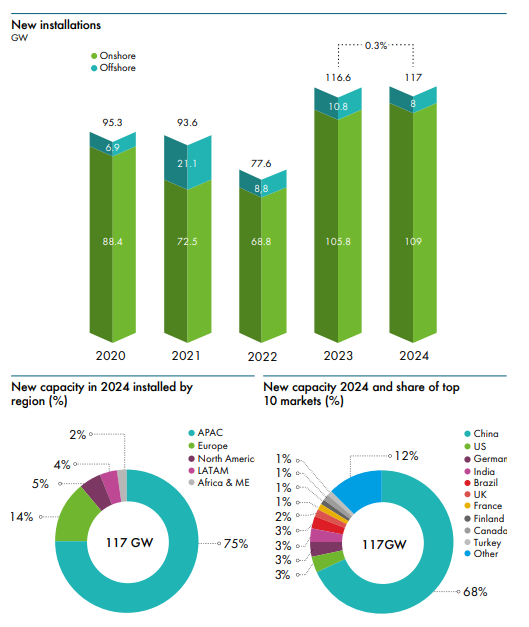GWEC subraya en su informe que si bien 2024 fue otro año récord para las instalaciones eólicas, las cifras principales ocultan grandes disparidades en términos del ritmo de implementación en los mercados globales, y que la mayor parte de las instalaciones se llevan a cabo en una pequeña cantidad de mercados maduros clave, incluidos China y Europa.