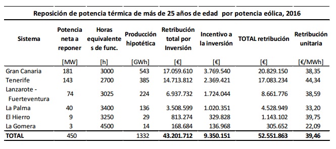 Según el informe de la CNMC, "utilizando los parámetros de cada instalación tipo (IT) determinados para las islas Canarias en el Anexo II de la Orden IET/1459/2014, se obtiene que estas nuevas instalaciones eólicas tendrían derecho a una retribución específica unitaria en torno a 39,46 €/MWh". ¿Conclusión? Si Canarias sustituyese esos 383,48 megavatios de potencia obsoleta (instalaciones que están "en operación a pesar de que hayan cumplido los 25 años de vida útil regulatoria", según la CNMC; instalaciones térmicas que emplean fuelóleo, diésel o gasóleo para generar electricidad) por 450 megavatios eólicos, Canarias generaría más electricidad (1.332 gigavatios hora al año de producción hipotética, según la CNMC, frente a los 819 que produjeron el año pasado las centrales térmicas) y los generaría además a un coste menor: el año pasado el coste del megavatio hora generado en esas centrales osciló entre los 223 euros de Gran Canaria y los 342 euros de El Hierro; el año que viene (si estuviesen los 450 megas ya montados) estaríamos hablando de una media de 39,46 euros el megavatio hora. Todos los datos son de la CNMC y aparecen en estas dos tablas que también hemos extraído del informe de la Comisión.