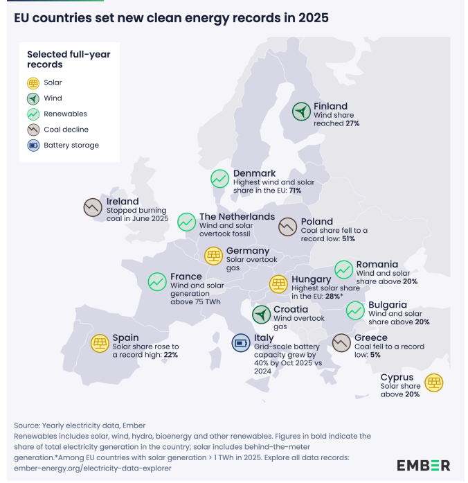 Además, el informe revela que las renovables en Países Bajos y Croacia han superado primera vez a los fósiles. En los Países Bajos, gracias al fuerte crecimiento de la energía solar (+31 % en comparación con 2024), mientras que el resultado de Croacia se vio impulsado por el fuerte crecimiento de la producción solar y eólica (+57 % y +19 % en comparación con 2024, respectivamente). Y destacan también países que antes dependían en gran medida del carbón, como Grecia, Bulgaria y Eslovenia, están muy cerca de alcanzar este punto de inflexión.