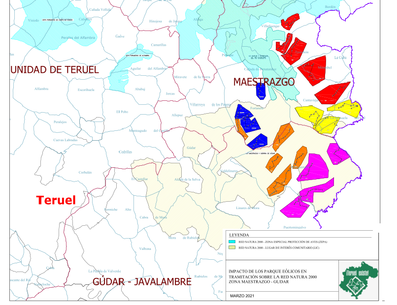 Según la declaración de impacto ambiental del megaproyecto, emitida por el Ministerio para la Transición Ecológica y el Reto Demográfico (MITECO), 14 de los 20 parques eólicos y 84 de los 125 aerogeneradores se instalarán en espacios turolenses de la Red Natura 2000, en concreto sobre dos zonas de especial conservación ZEC “Maestrazgo y Sierras de Gúdar” y ZEC “Rambla de las Truchas”. Asimismo, otros espacios se verán afectados por las infraestructuras eléctricas y viarias (un ZEC en Teruel y un LIC y una ZEPA en Castellón).