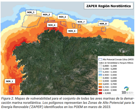 Tras la aprobación en febrero de 2023 de los Planes de Ordenación del Espacio Marítimo (POEM) comenzó la cuenta atrás para poder abordar una legislación que contemple los criterios de las subastas para el desarrollo de eólica marina en nuestro país, y así cumplir con el objetivo marcado a 2030 de 1 a 3GW instalados. Antes de que esto suceda (lo cual se prevé inminente), SEO/BirdLife ha considerado urgente clasificar las ZAPER en horquillas de riesgo. Estos rangos de riesgo van desde el nivel "muy alto" -puntuaciones entre 0.75 y 1-, "riesgo alto" -puntuaciones entre 0.50 y 0.74-, "riesgo medio" -puntuaciones entre 0.30 y 0.49- y "riesgo bajo" -puntuaciones por debajo de 0.30-.