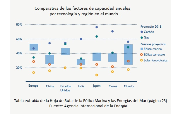 El recurso eólico existente en el mar es superior en términos de velocidad media, densidad energética y regularidad que en tierra firme. En 2018, el factor de capacidad global promedio para las turbinas eólicas marinas fue del 33% en comparación con el 25% para turbinas eólicas terrestres y el 14% para energía solar fotovoltaica. De cara al futuro, se espera que los nuevos proyectos eólicos marinos tengan factores de capacidad superiores al 40% en condiciones de viento moderado y de más del 50% en áreas con recurso eólico de alta calidad, llegando a alcanzar factores de capacidad comparables a otras formas de generación fósil. [Junto a estas líneas, tabla extraída de la Hoja de Ruta. En ella, el Ministerio presenta una comparativa de los factores de capacidad anuales por tecnología y región en el mundo. Como se aprecia, la eólica marina aventaja al gas].