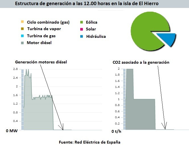 El objeto de la empresa Gorona del Viento es el siguiente: "análisis, desarrollo, promoción, construcción, operación y mantenimiento de la central hidroeólica de producción de energía eléctrica en El Hierro, mediante la utilización de la diversidad de energías renovables existentes, y su posterior entrega a la compañía distribuidora para el suministro final a todos los habitantes de la isla de El Hierro" (según el último censo publicado por el Instituto Nacional de Estadística, El Hierro tiene una población de 10.675 personas). Aparte de esa dimensión, el objetivo concreto de Gorona es ahorrar 6.000 toneladas al año de diésel, 40.000 barriles de petróleo (lo que equivale a día de hoy a aproximadamente 1,8 millones de euros al año). Diésel es el combustible que emplea para generar electricidad la central térmica que hay en El Hierro, Llanos Blancos (12,7 megavatios de potencia). Llanos Blancos (Endesa) ha estado abasteciendo de electricidad hasta ahora a la isla. Endesa asegura que instalaciones de estas características se pueden reproducir en mil islas de todo el mundo. Abajo, los datos facilitados por Red Eléctrica de España.