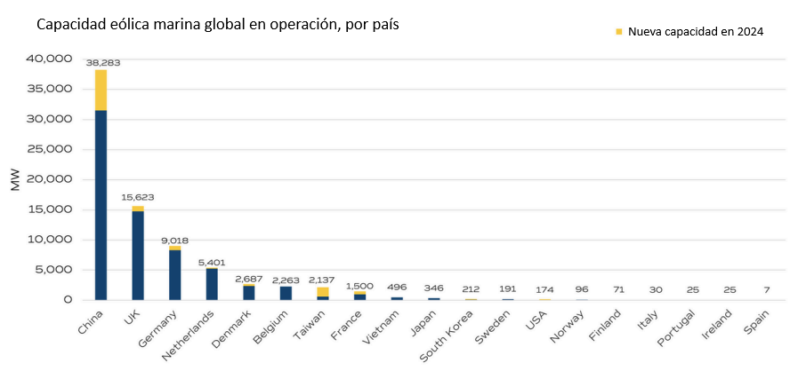 Otros países también están incrementando su capacidad eólica marina, lo que indica un cambio más amplio hacia carteras energéticas diversificadas y resilientes. Por ejemplo, en Europa, la energía eólica flotante está cobrando impulso, ya que Francia conectó en 2024 su primer parque eólico marino flotante: Provence Grand Large (25 MW), mientras que Corea del Sur puso en funcionamiento su mayor proyecto hasta la fecha: el parque eólico marino Jeju Hanlim (100 MW).