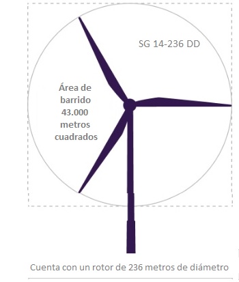 El modelo SG 14-236 DD que se instalará en este parque es el aerogenerador más potente de la cartera de Siemens Gamesa. El nuevo aerogenerador está equipado con un rotor de 236 metros de diámetro y utilizará palas de 115 metros de longitud. Su área de barrido, de 43.500 metros cuadrados, permite aumentar en un 30% -informa Siemens- la producción anual de energía en comparación con el modelo anterior, el SG 11.0-200 DD. Además, la turbina puede alcanzar los 15 MW de potencia con la funcionalidad Power Boost.