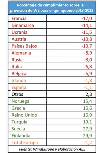 Aún más ajustado fue el error de la Asociación Empresarial Eólica (AEE) respecto al mercado español (-1,1%). De hecho, fuimos, de entre todas las asociaciones nacionales, la que más cerca se quedó de la realidad. Aunque hubiésemos preferido estar en la situación de la asociación finlandesa (que fue la que más falló por conservadora), ya que Finlandia en el periodo analizado es el país que acabó con más potencia eólica instalada, por encima de su previsión (+29,9%). En el otro extremo, Francia fue el país que acabó con menos potencia eólica instalada respecto a su previsión (-17%).