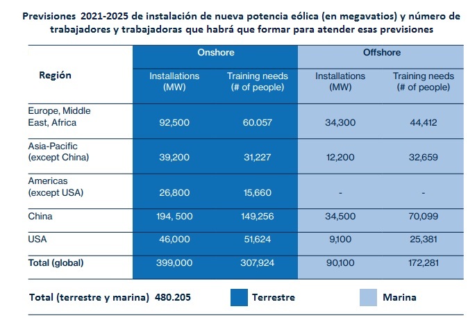 Según el informe de GWO y GWEC, de los 480.000 trabajadores y trabajadoras convenientemente formados que va a necesitar el sector a escala global, 308.000 serán empleados en la construcción y el mantenimiento de proyectos eólicos terrestres y 172.000 serán necesarios para la eólica marina.