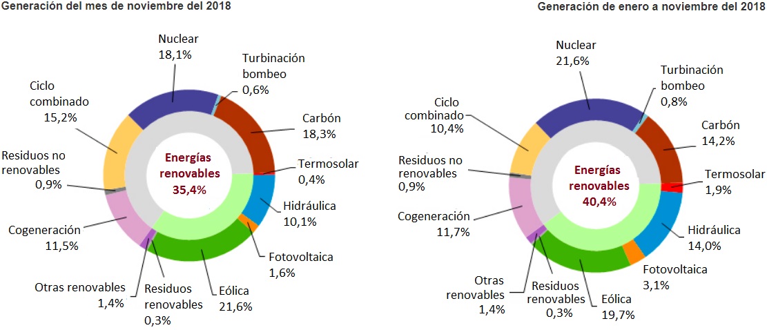Sí, el viento ha sido la primera fuente de generación de electricidad en España durante el mes de noviembre, con un 21,6% del total del mix. En lo que llevamos de año hasta el 40,4% de los kilovatios hora ha sido de origen renovable, es decir, que cuatro de cada diez kilovatios eléctricos que España demanda salen de recursos autóctonos (made in Spain): el agua, el Sol, el viento, la biomasa. Los combustibles fósiles no obstante siguen produciendo mucha electricidad en el país: hasta el 36,3% de los kilovatios hora eléctricos que ha demandado España en lo que va de año han salido de centrales térmicas que queman carbón o gas natural (ciclos combinados y cogeneración). Queman combustible y emiten gases de efecto invernadero, desencadenantes de cambio climático. La nuclear queda en tercer lugar, con el 21,6% del total. Abajo, generación del mes de noviembre (a la izquierda); y global enero-noviembre.