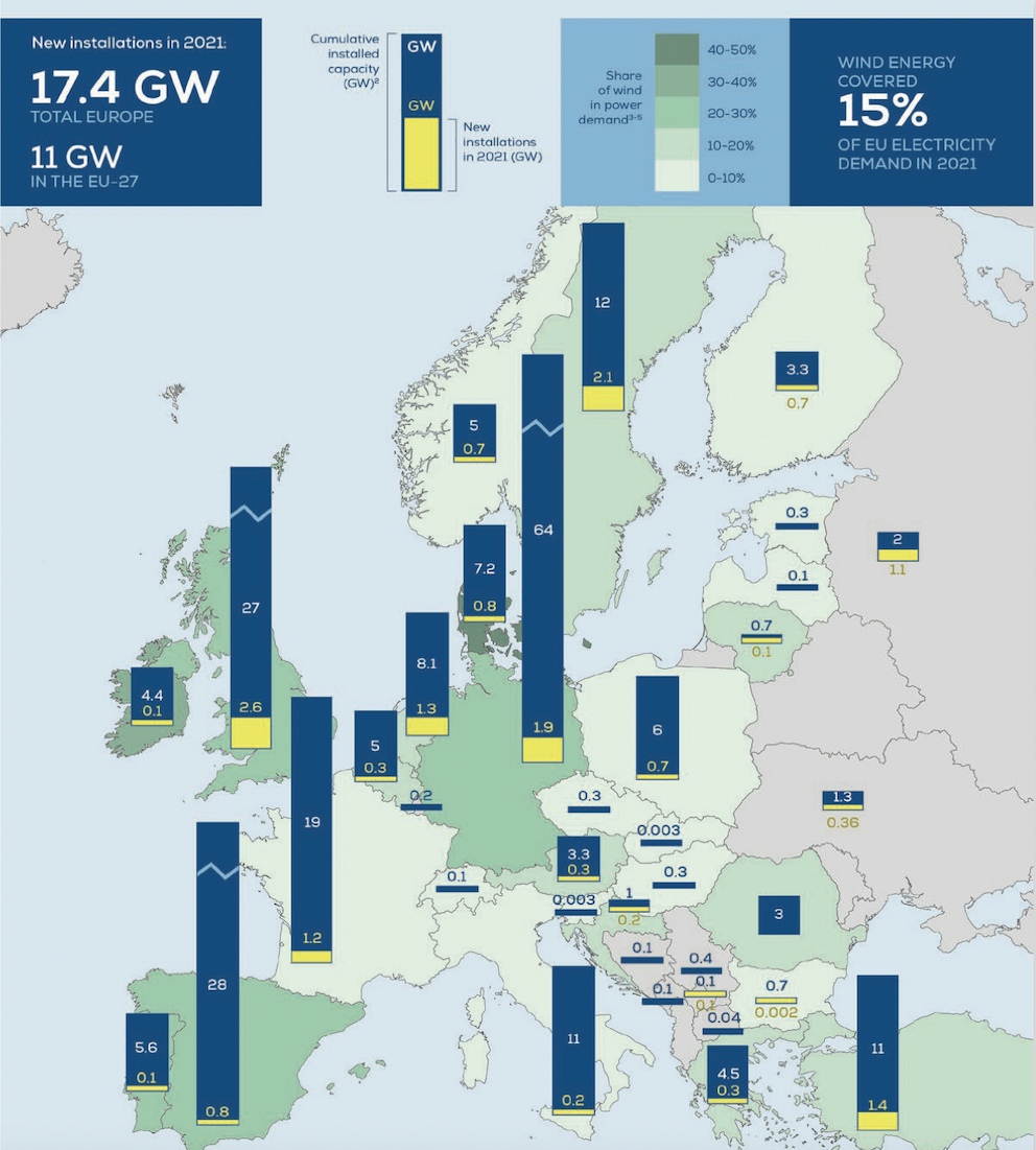 Las Estadísticas Anuales 2021 de WindEurope, publicadas por la asociación el pasado 24 de febrero, dejan en evidencia la insuficiente velocidad de expansión de la energía eólica en Europa. En el conjunto del continente, el año pasado se instalaron 17,4 GW en aerogeneradores (3.4 GW marinos), de los cuales 11 GW se levantaron en la UE de los 27. Estas cifras sitúan la capacidad eólica instalada en Europa a día de hoy en 236 GW (207 GW en tierra y 28 GW en el mar); en el caso de la Unión Europea son 189 GW (173 GW en tierra y 16 GW en el mar).