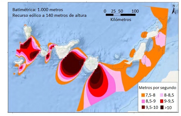 En el caso de Canarias, la altura seleccionada para los estudios llevados a cabo en los POEMs ha sido 140 metros, que se corresponde con la altura de buje de la mayoría de los aerogeneradores de gran potencia que están siendo considerados por promotores para eólica marina (10-15 megavatios).