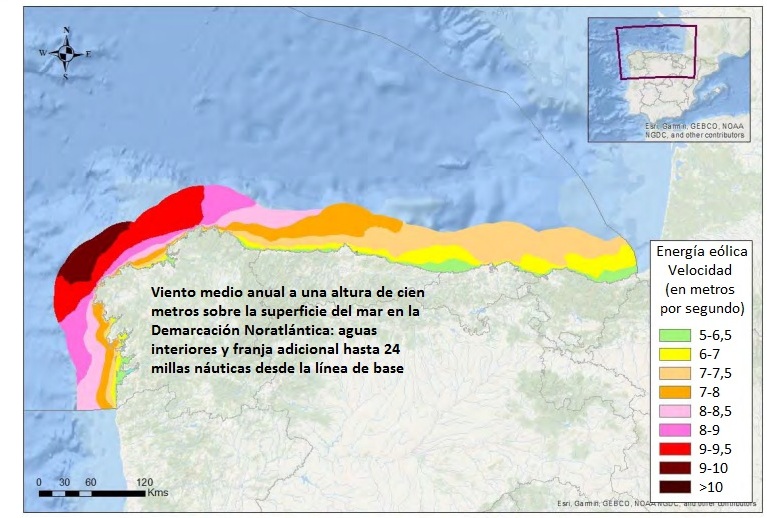 En la Demarcación Marina (DM) Noratlántica, las zonas de uso prioritario y de alto potencial para la energía eólica marina eran 8 en los borradores de los POEMs. En total, ocupaban una superficie de 4.454,76 kilómetros cuadrados (lo que supone un 1,42% de la superficie de la demarcación) y distaban y distan de la costa entre 14 y 31 kilómetros. En esta DM las zonas más ventosas están en la franja marítima que rodea la comunidad autónoma de Galicia, que se halla bajo la influencia de los frentes atlánticos y que presenta máximos en su vértice noroeste y también en cierta medida frente a las costas asturianas. En los POEMs aprobados que acaban de salir del Consejo de Ministros, se ha pasado de esos más de 4.400 kilómetros cuadrados de zonas de uso prioritario y/o alto potencial a menos de 2.700 autorizados para la instalación eólica.