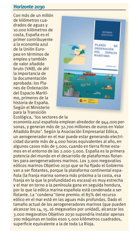 ¿Y cuál es el objetivo eólico marino de España? Pues el objetivo eólico marino que se ha fijado el Gobierno en su Plan Nacional Integrado de Energía y Clima es tener entre 1.000 y 3.000 megavatios de potencia en el mar en el año 2030, objetivo que quedaría asegurado, “de sobra”, con ese espacio, según el Ministerio. ¿Y qué suponen 3.000 megavatios? Pues, dado el tamaño actual de los aerogeneradores marinos (que pueden alcanzar los 14, 15, 16 megavatios por unidad), alcanzar el óptimo de esa horquilla (los 3.000 megavatios) supondría instalar apenas 200 máquinas en todos esos 5.000 kilómetros cuadrados, superficie equivalente a la de toda La Rioja.