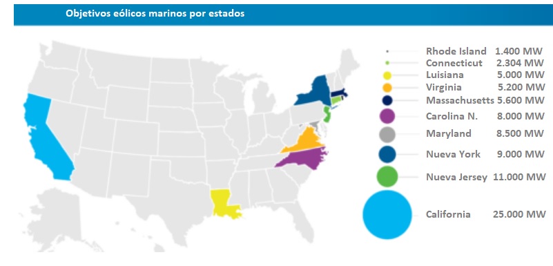 El estado de Nueva York lidera la carrera de la eólica marina made in USA, con 4.362 megavatios de potencia en la cartera (132 megavatios en construcción, parque South Fork). Viene a continuación Nueva Jersey, con 3.758 megas (todos ellos en fase avanzada de desarrollo: "all of which is in advanced development"). Massachusetts es el tercer estado con un parque eólico marino en construcción. Se trata de Vineyard (806 MW), un parque cuyas obras está previsto concluyan este mismo año (el parque tiene 806 megavatios de potencia). Vineyard representa prácticamente el 25% de la potencia que tiene este estado en cartera (3.242 MW).