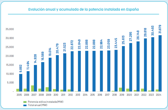 En 2024, se ha instalado algo más de 1 GW eólico "cuando se deberían instalar más de 5 GW al año para cumplir con los objetivos establecidos en el PNIEC", es decir, llegar a 59 GW terrestres y 3 GW marinos. El ritmo de avance real del PNIEC y el escenario a corto-medio plazo no hacen viable pensar en su cumplimiento como un "objetivo realista", señalan. Sin embargo, la AEE subraya que el mensaje clave "no es cumplirlo a toda costa, sino cumplirlo de forma sostenible y con equilibrio de todos los vectores involucrados: generación, demanda y gestionabilidad".