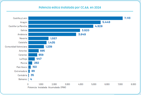 La energía eólica tiene presencia en prácticamente todas las comunidades autónomas, exceptuando Madrid, Ceuta y Melilla. Un total de 47 provincias cuentan con generación eólica y 20 ya generan más de 1TWh de electricidad (cubre el consumo de 285.000 hogares en España, según los datos de la AEE).