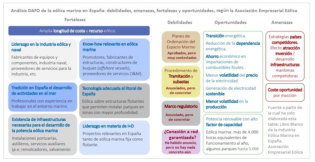 El sector eólico nacional ha hecho virtud de la necesidad y lleva ya muchos años desarrollando soluciones flotantes (plataformas sobre las que ubicar los aerogeneradores) que superan ese obstáculo (el de las grandes profundidades). Y ahora mismo -apuntan desde la Asociación Empresarial Eólica- España "se encuentra ante una oportunidad única como país para ser líder mundial en el desarrollo del sector eólico marino flotante, siendo ya un hub industrial y de desarrollo tecnológico". [Bajo estas líneas, Análisis DAFO del sector, por la Asociación Empresarial Eólica].