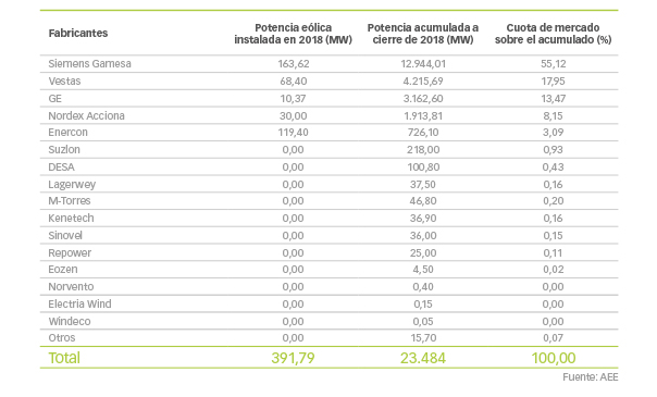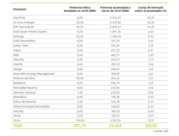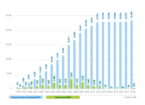 La potencia eólica aumentó el año pasado en España en 392 MW, lo que sitúa el total instalado, a 31 de diciembre de 2018, en 23.484 MW, según datos recabados por la Asociación Empresarial Eólica (AEE). Esta potencia eólica nos convierte en el segundo país europeo con mayor potencia instalada.