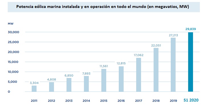El informe que acaba de publicar el World Forum Offshore Wind (WFO), asociación integrada por los actores clave de este sector, le pone todos los números imaginables al semestre. Para empezar, la potencia eólica instalada ahora mismo en el agua ronda los 30.000 megavatios (a mediados de 2015 no alcanzaba los 10.000, o sea, que el parque eólico marino global ha triplicado su potencia en solo cinco años). En total, hoy son -lo contábamos ayer- 157 los parques en fase de operación: 105 se encuentran en aguas europeas; medio centenar, en Asia; y dos, en los Estados Unidos (el World Forum Offshore Wind considera parque eólico marino a toda aquella instalación integrada por al menos dos aerogeneradores). En los seis primeros meses del corriente, diez parques marinos han entrado en operación (por tal se entiende que todas las turbinas están instaladas y que ya se ha inyectado electricidad a la red). Diez parques; 2.624 megavatios; en seis países: Reino Unido, China, Alemania, Portugal, Bélgica y los Estados Unidos. El sector instaló en los doce meses del año pasado 5.194 megas, o sea, que este año, la industria eólica -incluso en medio de una pandemia que todo lo ha trastocado- podría igualar ese guarismo, que es en todo caso el Top de todos los tiempos (nunca antes el sector había instalado tantos megavatios en el mar en solo doce meses).