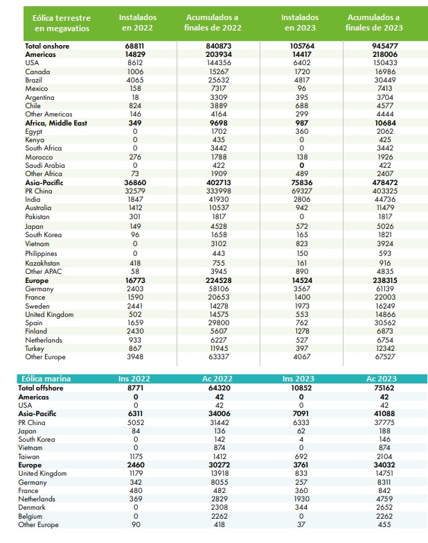 · China estableció el año pasado un nuevo máximo histórico de instalación (75 gigavatios). A finales de 2023 registraba más de 400 gigavatios de potencia eólica instalada. El gigante asiático es punta de lanza de un continente que ha vivido un 23 histórico, con un crecimiento de más del 100%.