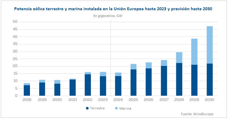 El Anuario 2023 de WindEurope incluye un apartado de Perspectiva 2024-2030 (previsiones) que la asociación ha elaborado a partir de los proyectos en cartera, las inversiones anunciadas y la información disponible sobre autorizaciones administrativas y subastas gubernamentales. Según esas Previsiones, la Unión Europea instalará una media de 29.000 megavatios por año (29 gigas cada curso) a lo largo del próximo septenio (2024-2030), es decir, que casi doblará, cada uno de esos años, la potencia eólica que ha instalado en este año 2023 que acaba de concluir, ejercicio en el que ha firmado como se dijo 16 gigas.