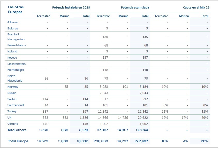 • Dinamarca e Irlanda han sido las dos naciones en las que la electricidad eólica ha tenido más peso en el mix nacional, con el 56 y el 36% respectivamente. Otros ocho países han superado el listón del 20%: Alemania (31%), Reino Unido (29), Países Bajos (27), España (27, ó 23,5%, según REE), Suecia (26%), Portugal (26), Lituania (21) y Grecia (20). [Bajo estas líneas, tabla en la que WindEurope recoge los datos relativos a todos los países que no forman parte de la Unión Europea, como Suiza, Ucrania, Rusia, Noruega o Reino Unido: detalle de la potencia instalada en cada uno de ellos en 2023; de la potencia acumulada; y de la cuota de eólica en cada mix eléctrico nacional. Fuente: WindEurope].