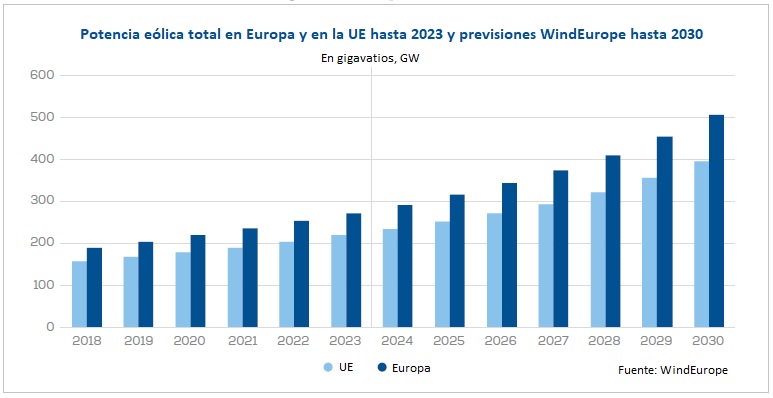 Ese es la gran idea fuerza del informe Estadísticas 2023 y Previsiones 2024-2030 que publicó hace unas semanas la asociación del sector eólico europeo, WindEurope. A continuación, los datos.