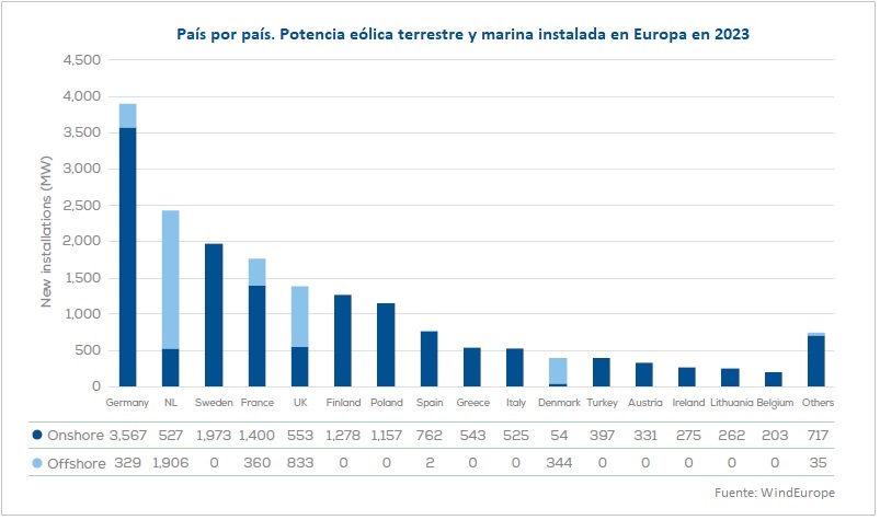 • Alemania ha sido el país que más potencia ha añadido en 2023 a su parque eólico nacional: 3.900 megavatios, el 92% de los cuales han sido terrestres. Países Bajos (2.400), Suecia (2.000), Francia (1.800), Reino Unido (1.400), Finlandia (1.300) y Polonia (1.200 MW) han ido a continuación.