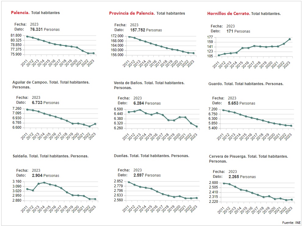 [Bajo estas líneas, evolución de la población en Palencia ciudad, en la provincia, en Hornillos de Cerrato y en algunas de las principales localidades de la provincia].