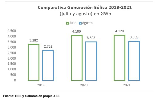 En concreto, AEE señala que la energía del viento produjo en agosto pasado 3.565 GWh, un 17,5 % de la estructura de la generación por tecnología, y afirma que la generación ha sido mayor en 2021 en los meses de agosto y julio que en los dos años anteriores. En el caso de agosto, un 1,6% superior a la de agosto 2020 y considerablemente mayor que hace dos años (+30%).