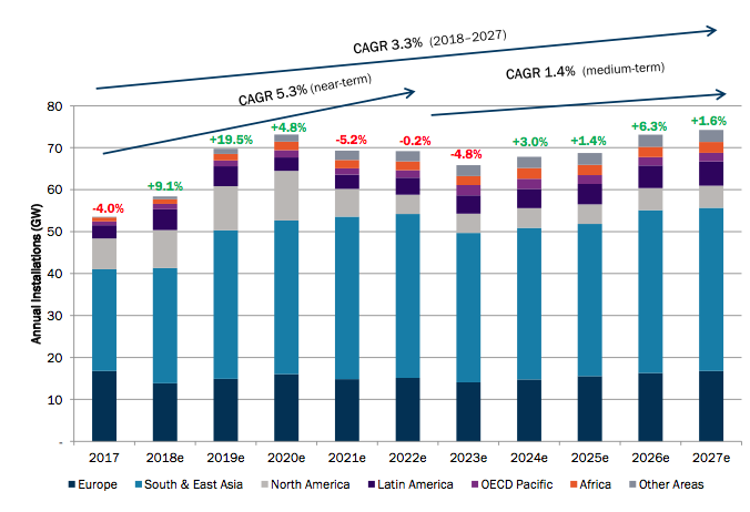 El mayor mercado mundial se localizará, como ya ocurre actualmente, en Asia-Pacífico, donde se instalarán, aproximadamente, 382 GW durante el período 2018-2027 (5% de incremento anual). China continuará dominando el mercado, ya que según el informe agregará 296 GW entre 2018-2027 (equivalente al 43% de las instalaciones globales totales).