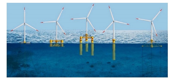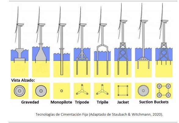 Volviendo otra vez la mirada al norte, ya hay varios países que cuentan con parques eólicos marinos flotantes en el Viejo Continente, como Reino Unido (treinta megavatios, 30 MW), Portugal (25 MW) y Noruega (3,6 MW), y también hay naciones que están ahora mismo desarrollando proyectos que pondrán en servicio en los próximos 3 años, como Francia (113,5 MW), Noruega (88 MW) y Reino Unido (48 MW). Muchos gobiernos, en todo caso, tienen claro que la eólica marina, sea cimentada al lecho, sea flotante, es parte clave de la solución al desafío energético en el que estamos metidos. "Como referencia -señala la AEE en su informe-, Italia, el país con menores objetivos en eólica marina, plantea 900 MW de offshore a 2030, con unas condiciones de viento muy inferiores a las de España". El Gobierno español sin embargo no especifica objetivo eólico marino alguno en su Plan Nacional Integrado de Energía y Clima, lo que contrasta poderosamente con la actividad del sector eólico nacional, que no solo ha protagonizado, junto a otros actores internacionales, la revolución eólica que ha tenido lugar a escala global a lo largo de las tres últimas décadas, sino que, además, en lo que a la marina se refiere, es extraordinariamente activo. Ahora mismo existen numerosos conceptos de energía eólica flotante que están siendo desarrollados en diferentes regiones, Europa, Estados Unidos y Japón a la cabeza. Pero se da la circunstancia de que España es el país en el mundo con el mayor número de tecnologías desarrolladas (9 de 34 a principios de 2021). [Junto a estas líneas, tecnologías de cimentación fija; más abajo, algunas de las soluciones flotantes con las que la industria ya está trabajando].