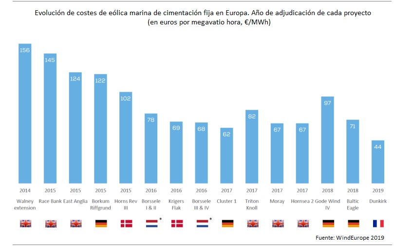 Según AEE, el 80% del recurso eólico marino en Europa se encuentra localizado en aguas de más de 60 metros de profundidad. Y la situación actual de la tecnología de eólica flotante "ya permite hoy en día -aseguran en la asociación- la instalación de grandes parques comerciales" en aguas con esas profundidades. Es más, concretamente en Canarias, ahora mismo sería más barato generar electricidad con un parque eólico marino flotante que producir esa electricidad tal y como lo hacen, es decir, quemando combustibles fósiles (diésel, gas, fuelóil). Según el Anuario Eléctrico de Canarias, el coste medio de la generación en el archipiélago en 2019 se situó en los 152,45 euros. Pues bien, los costes de los proyectos comerciales flotantes -señalan en AEE- oscilan en la actualidad entre los 80 y los 100 euros el megavatio hora, es decir, que generar un megavatio hora en una plataforma eólica flotante es mucho más barato que hacerlo en tierra firme en una central térmica de fuel como las que tiene Endesa en Canarias. Eso, sin entrar en los números de la eólica marina de cimentación, que viene arrojando números extraordinarios: 44 euros el megavatio hora en subastas de 2019, cuando apenas cinco años antes, en 2014, las subastas estaban en los 150 euros (entre la fecha de adjudicación y la puesta en servicio del parque suelen pasar entre cuatro y seis años).