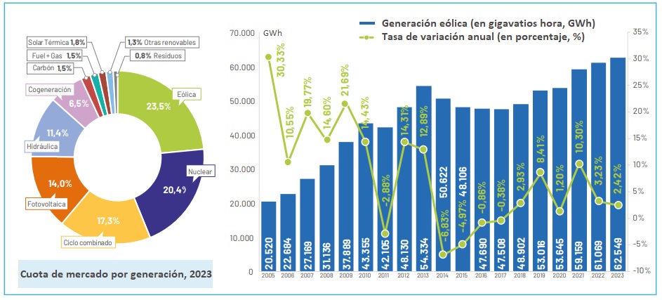 [Bajo estas líneas, a la izquierda, en la rueda de colores, reparto (por tecnologías) de la generación de energía eléctrica (en porcentajes). A la derecha, en el gráfico de las columnas, evolución de la generación 2005-2023. Como se aprecia en esta parte, en el primer año de la serie el parque eólico nacional (que entonces medía 9,8 gigavatios) generó 20.500 gigavatios hora de electricidad, mientras que en el último año de la serie, 2023, el parque eólico (ahora con más de 30 gigas) ha generado más del triple: 62.549 GWh].