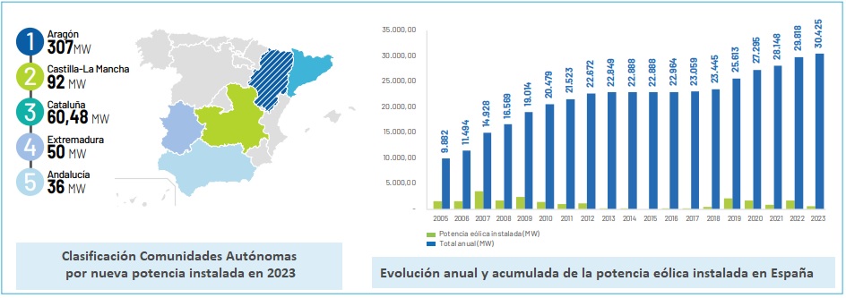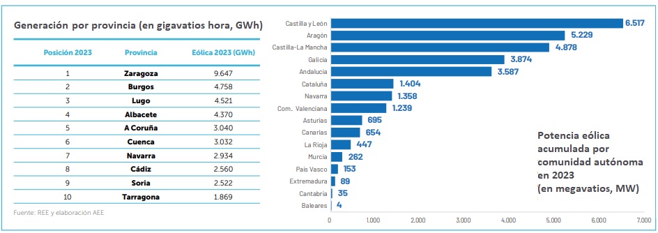 • 47 provincias cuentan con generación eólica, de las cuales 20 generan más de un teravatio hora de electricidad gracias al viento (1 TWh). Castilla y León, con 6.517 megavatios, es la comunidad autónoma con mayor potencia eólica instalada. Aragón ha sido en 2023 la comunidad autónoma que ha destacado por su incremento de potencia eólica con 307 megavatios nuevos, seguida de Castilla La Mancha (92 megas) y Cataluña (60 MW).