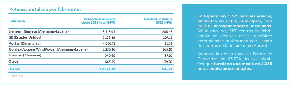 • A 31 de diciembre de 2023, la potencia total instalada en España era de 30.425 MW. Los más de 22.200 aerogeneradores instalados en España en 1.371 parques eólicos, generaron 62.594 gigavatios hora de electricidad, un 2,4% más que en 2022.