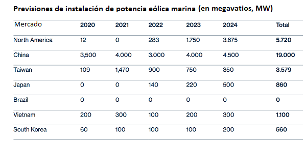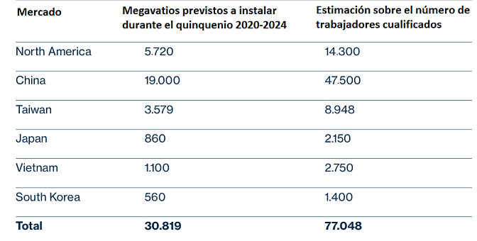 El Consejo Global de la Energía Eólica y la Organización Eólica Mundial acaban de publicar un informe en el que presentan sus estimaciones sobre la demanda de obra de mano cualificada que va a haber a lo largo del próximo quinquenio -2020/2024- en seis mercados eólicos marinos emergentes: China, Taiwán, Japón, Vietnam, Corea del Sur y el norte de América. El informe, que se titula Powering the Future: Global Offshore Wind Workforce Outlook 2020-2024, y que ha sido elaborado en colaboración con el centro de investigación Renewables Consulting Group, ha dejado un titular muy concreto: van a ser necesarios más de 77.000 trabajadores cualificados para desplegar los 31.000 megavatios de potencia eólica marina que hay planificados en esos seis mercados, o sea, 2,5 trabajadores por megavatio a instalar.