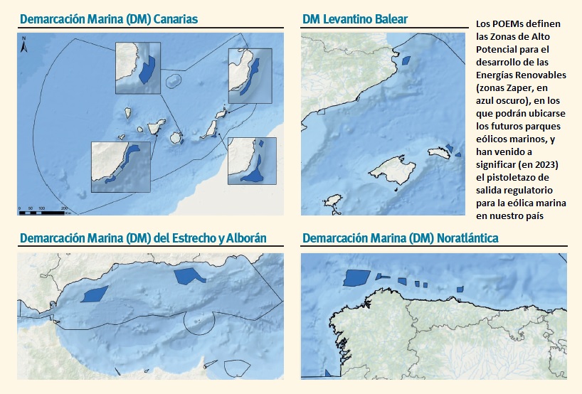 Los POEMs definen las Zonas de Alto Potencial para el desarrollo de las Energías Renovables (zonas Zaper), en las que podrán ubicarse los futuros parques eólicos marinos, y han venido a significar (en 2023) el pistoletazo de salida regulatorio para la eólica marina en nuestro país.